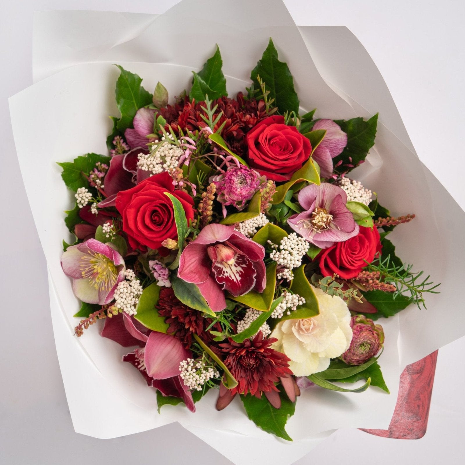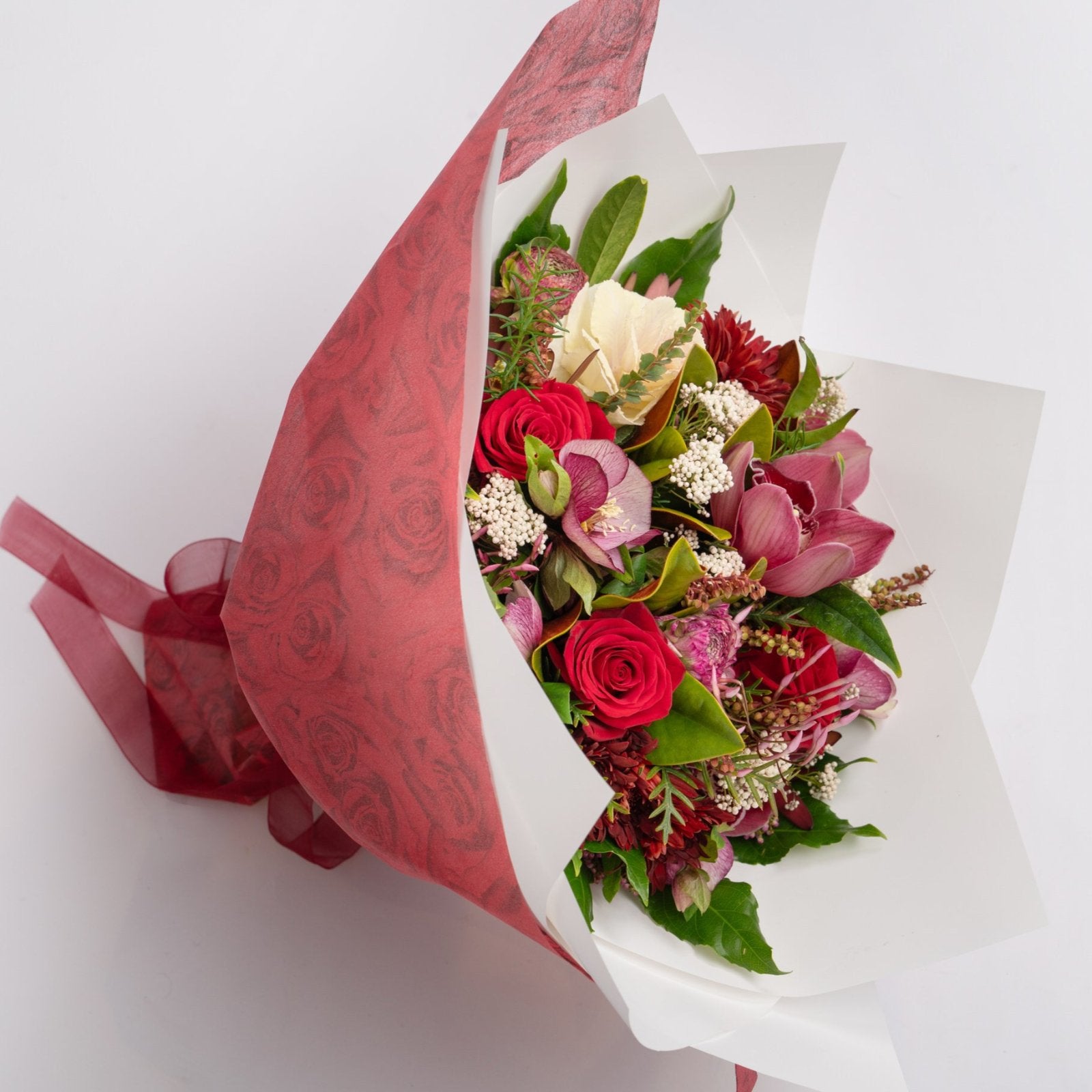A stunning, hand-selected bouquet crafted in deep ruby jewel tones, featuring beautiful roses and a luxurious mix of seasonal blooms. This elegant arrangement is thoughtfully designed by our florist to create a captivating display full of passion and warmth—perfect for making any occasion unforgettable.   *Bouquet pictured is large size