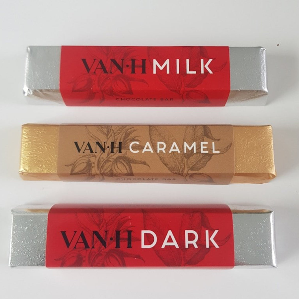 Choose from our individual Van. H chocolate bars, available in smooth milk, rich caramel, or intense dark chocolate. Crafted locally in Christchurch, each bar offers a delicious taste experience made with care and quality ingredients.