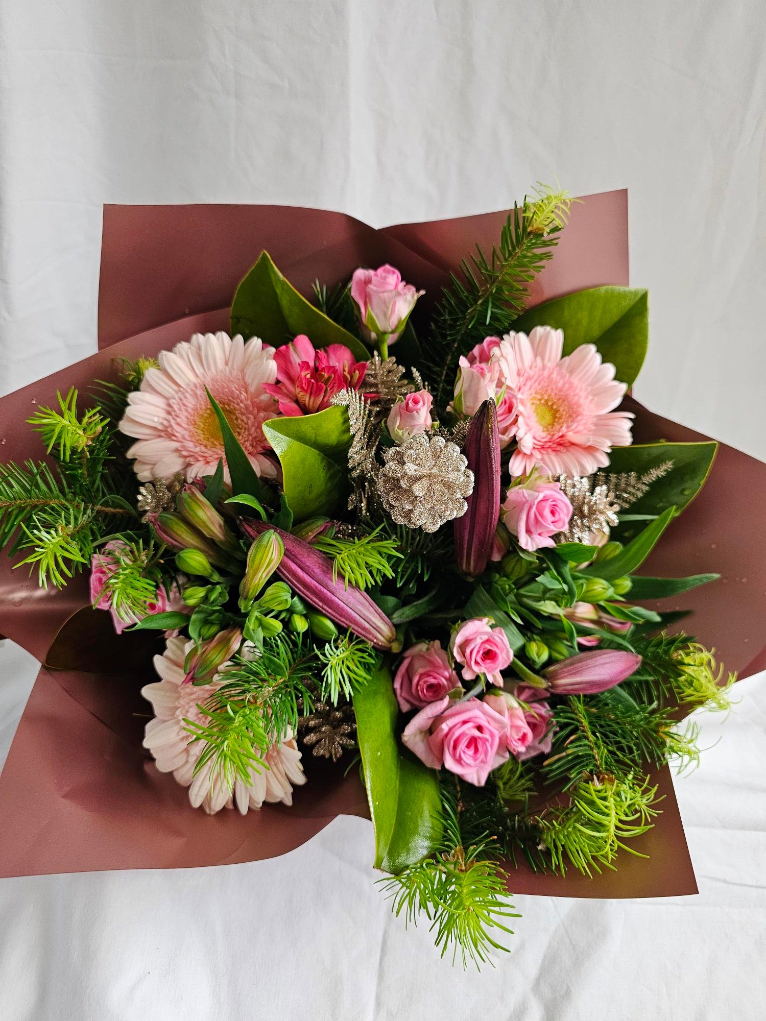 Florist Choice Christmas Posy for the lover of all thing PINK and SPARKLY! Includes Christmas lilies