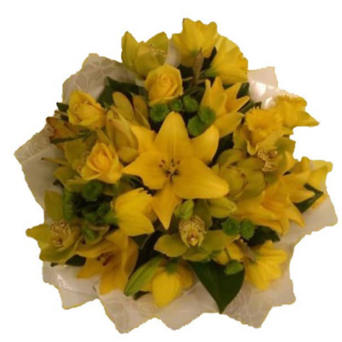 Brighten any space with this delightful bouquet of yellow lilies, roses, and a mix of seasonal yellow flowers, beautifully arranged and presented in a water-filled vase. Radiating warmth and cheer, this sunny arrangement is perfect for celebrating joyful moments or simply lifting someone’s spirits.   **Bouquet pictured is luxurious size